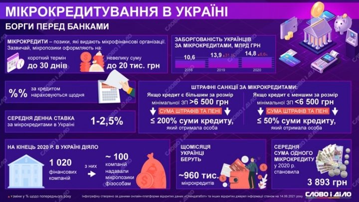 В прошлом году из-за коронакризиса увеличился спрос на микрокредиты. Задолженность украинцев выросла на 6,6% – до 14,8 млрд грн. В 2020 году средняя сумма одного микрокредита составляла 3893 грн.
