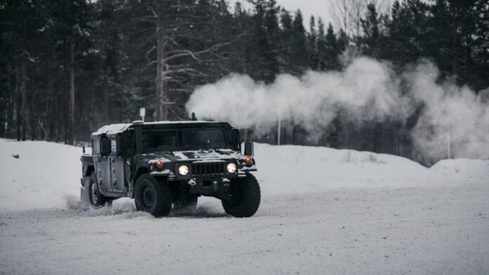 Американские морпехи во время проведения учений в Норвегии показали эффектный дрифт по снегу на бронированных многоцелевых автомобилях HMМWV