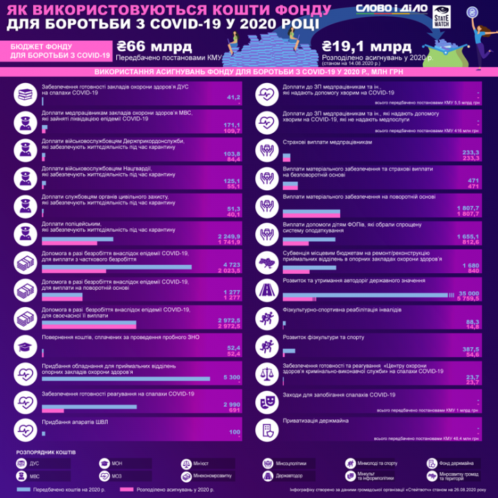 В Украине в начале апреля был создан Фонд для борьбы с коронавирусом объемом 66 млрд грн. По состоянию на 14 августа более 19 млрд из него потратили. Куда распределят остальные средства, тоже уже понятно – соответствующие подсчеты Госказначейства есть в распоряжении общественной организации StateWatch.