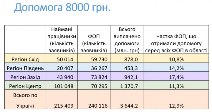 «Среди наиболее эффективных, по нашему мнению, мер, применяемых центральной властью — пособие в сумме 8 тыс. гривен тем ФЛП, которые не могли работать из-за коронавируса. Мы собрали статистику первых выплат еще в 2020 году и видим, что достаточно большое количество ФЛП и наемных работников получили эти средства», — отметили аналитики.