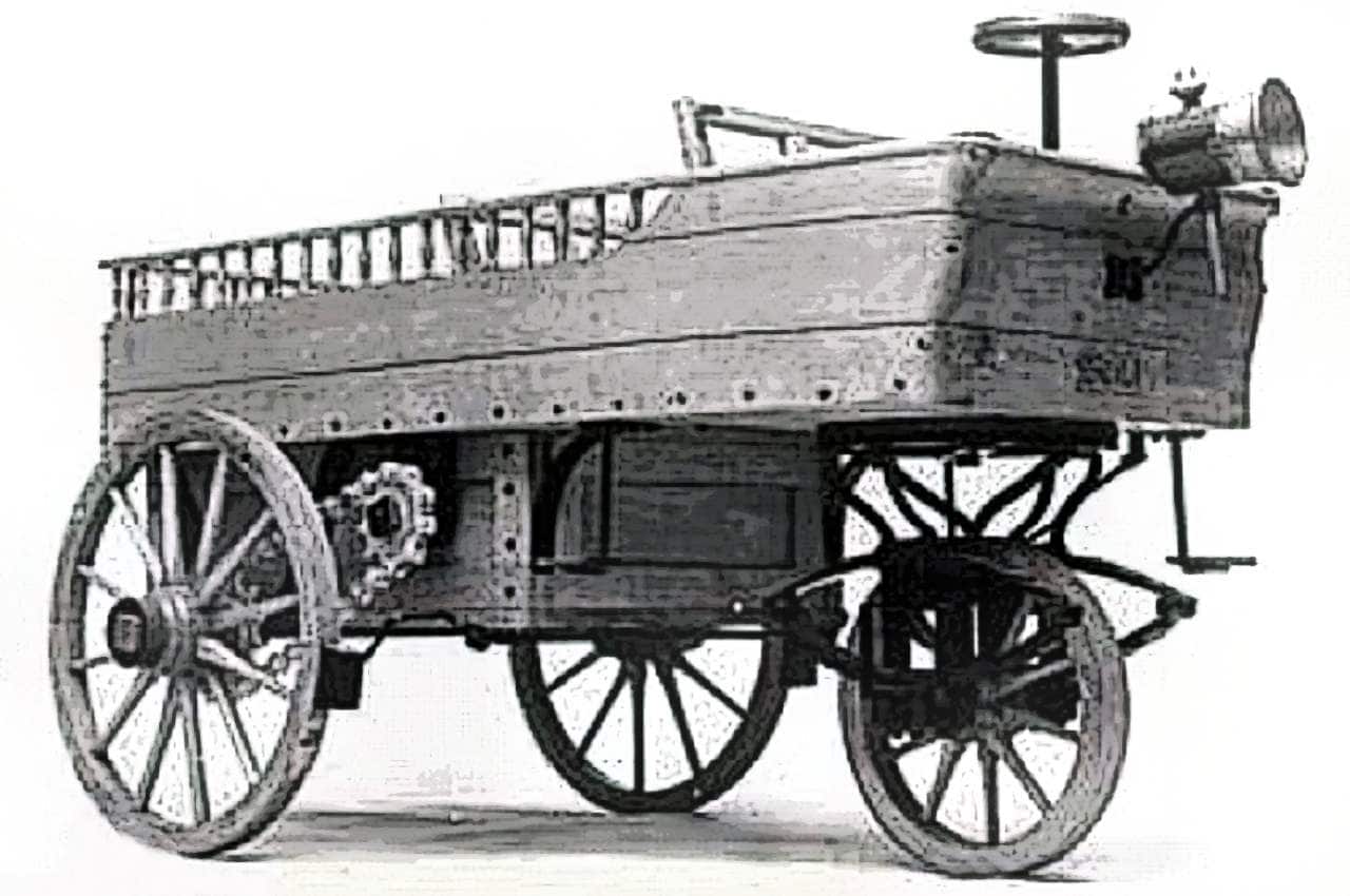 Принцип его работы был таким же, как и у стационарных двигателей – то есть он был двухтактным, двустороннего действия. Он имел рабочий объем 2543 см куб., а мощность его составляла 1,5 л. с. при 100 об/мин. Для приготовления горючей смеси служил примитивный карбюратор. Интересно, двигатель нагревался до очень высокой температуры и конструктору пришлось снабдить его специальной системой водяного охлаждения. Привод на заднюю ось был цепной.
