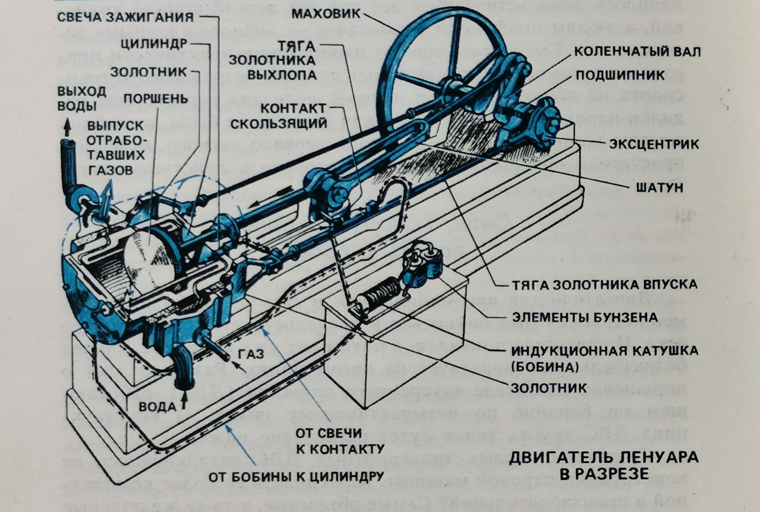 Подобно паровому это был агрегат двустороннего действия, то есть горючая смесь, состоящая из светильного газа и воздуха, поступала в цилиндр по специальным каналам – то с одной, то с другой стороны поршня. Двигатель был двухтактным, а зажигание уже имел батарейное – с индукционной катушкой и свечами.