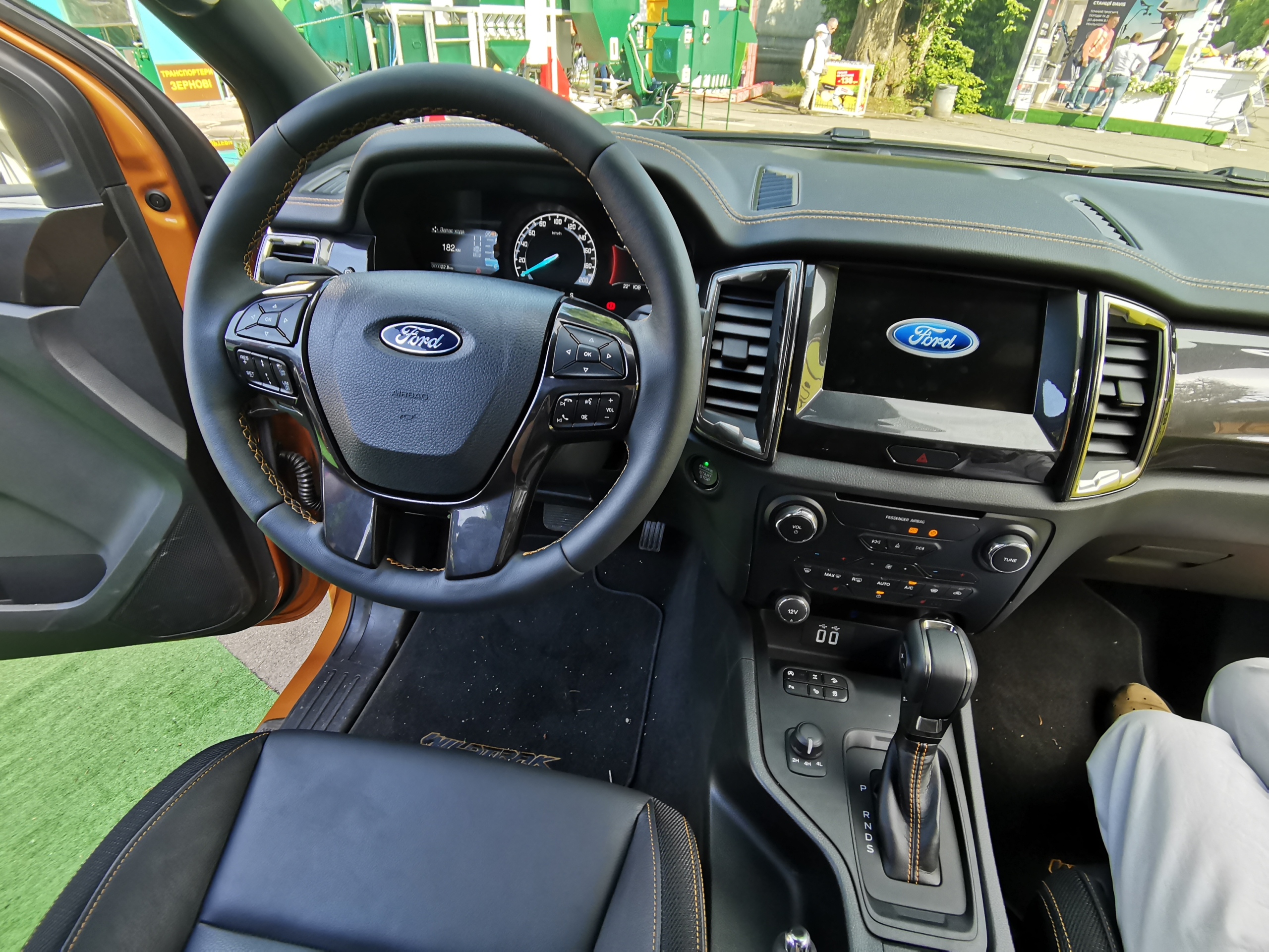 Начнём с пикапа Ford Ranger Wildtrak. Машина представлена в топовой комплектации – с 2,0-литровым двигателем битурбо мощностью 213 л. с. (500 Нм при 1750 – 2000 об/мин). С мотором в паре работает 10-ступенчатая АКП.