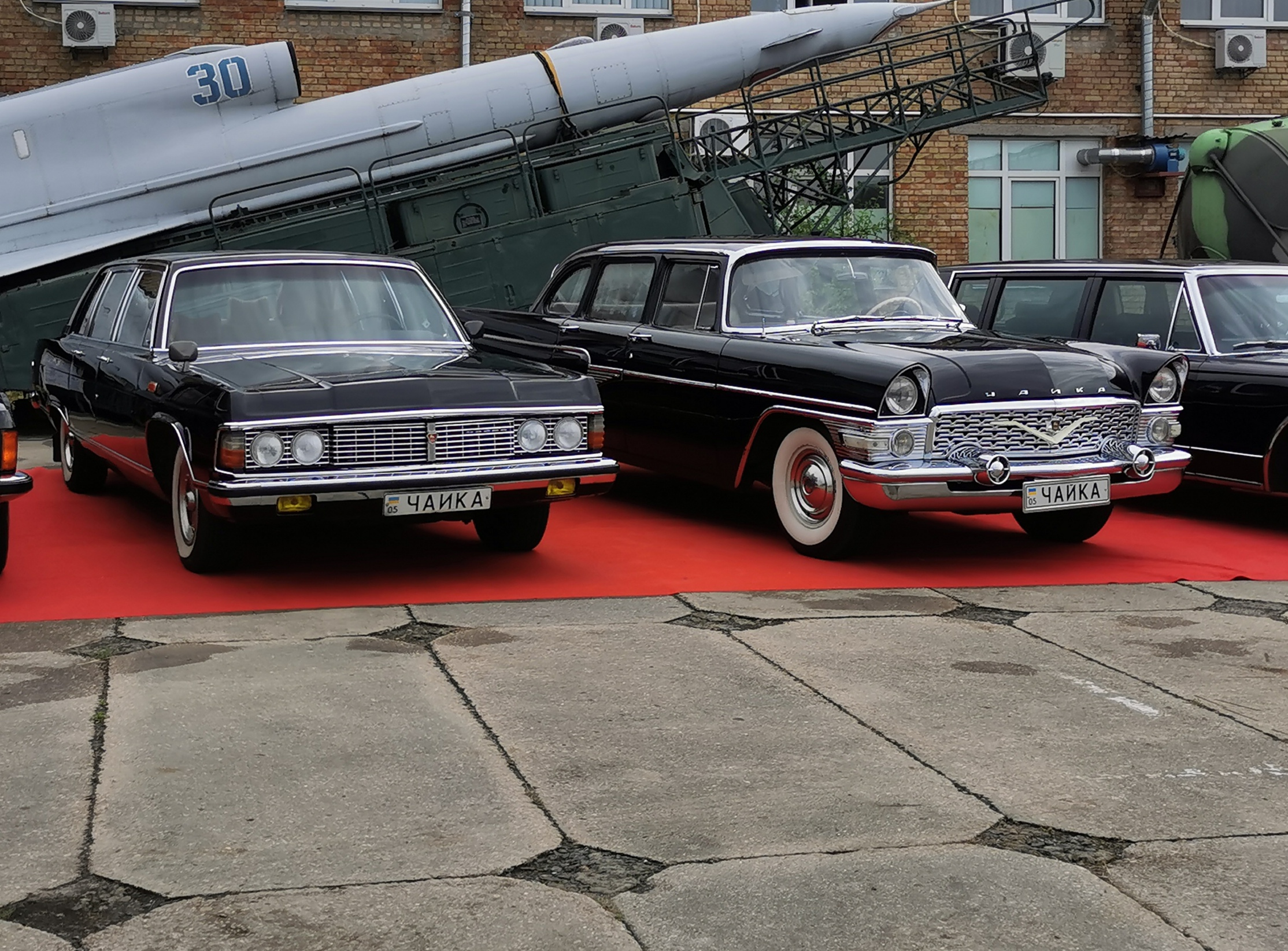 Экспозицию Old Car Land 2021, по традиции разместившуюся на территории Государственного музея авиации, открывала эффектная коллекция представительских автомобилей, выпущенных в разные годы.