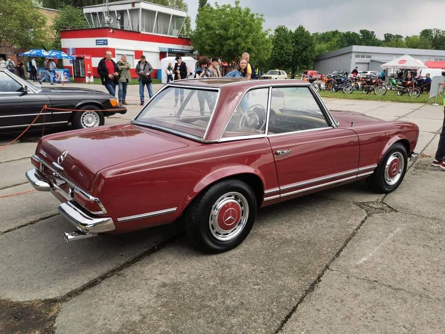 Индекс SL расшифровывается как Super Light («сверхлегкий»), так как капот, двери и крышка багажника были изготовлены из алюминия. Модель 230 SL имела «шестерку» рабочим объемом 2,3 л мощностью 150 л.с. и могла развивать 195 км/ч. Интересно, что Mercedes-Benz впервые предложил на автомобилях такого типа автоматическую коробку передач (опция). Представленная на выставке модель имеет оригинальную съемную жесткую крышу. Эти машины также выпускались и с брезентовом верхом. Всего в 1963 – 68 гг. выпущено 19 831 автомобиль модели 230 SL.