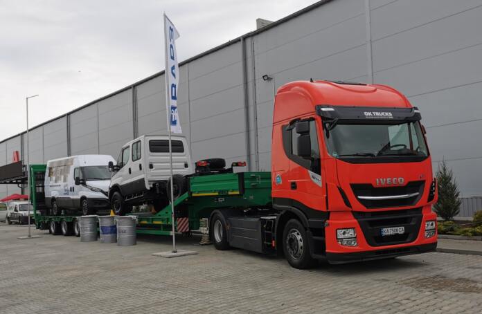Компания АМАКО презентует седельный тягач IVECO Stralis NP с 400-сильным двигателем, работающим на природном газе. У него на прицепе (трейлере-тяжеловозе украинского производителя ВАРЗ) мы видим легкие развозные IVECO Daily: фургон, работающий также на газе, а также шасси 4х4 с двухрядной кабиной.