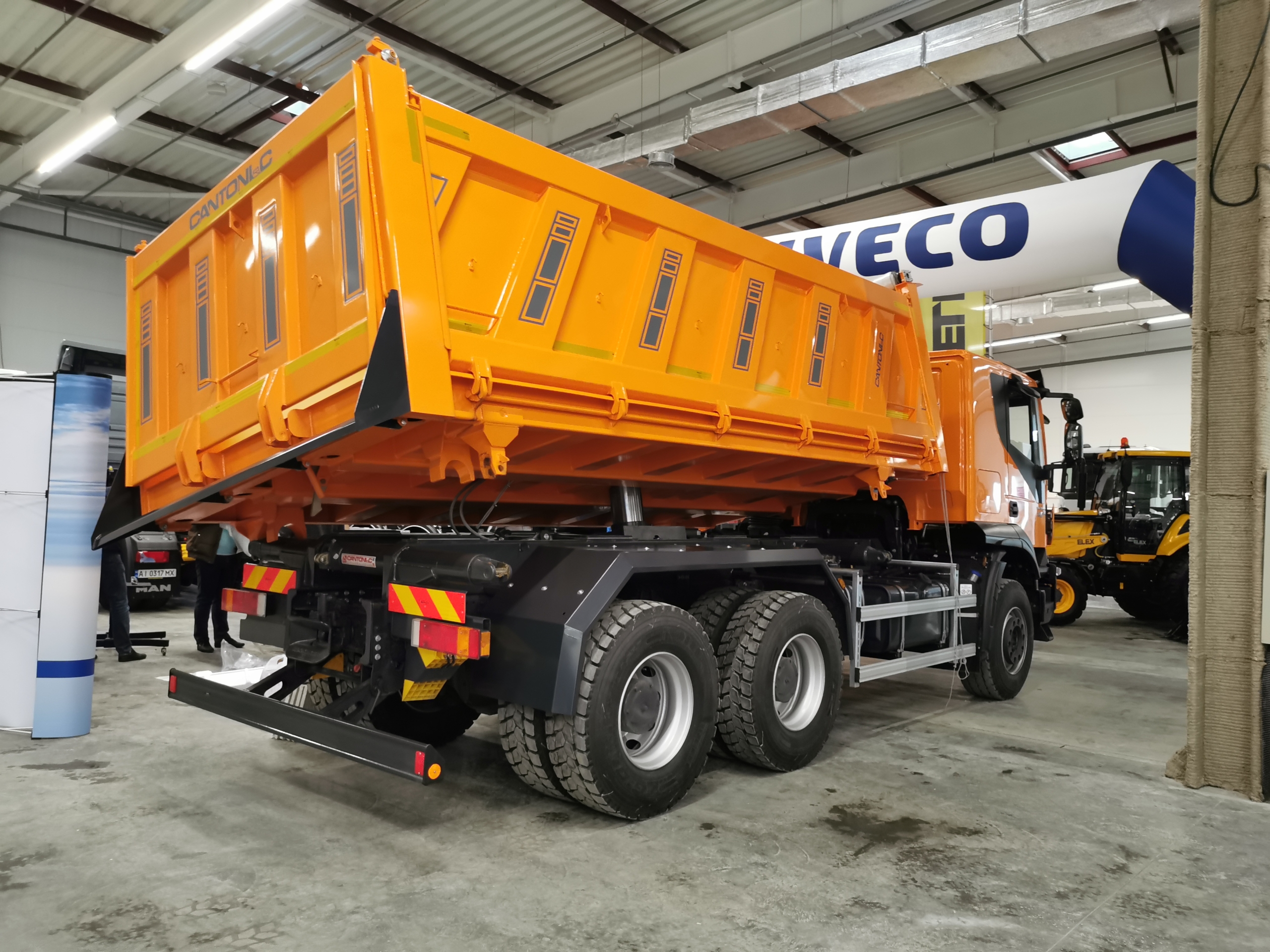 В помещении заслуживает внимание грузовик IVECO Trakker 410 (6х4) с самосвальным кузовом Cantoni трехсторонней разгрузки.
