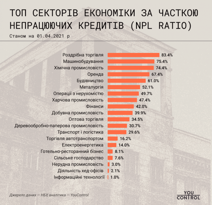 У предприятий розничной торговли (83,4%) — очень высокий уровень неработающих кредитов, тогда как оптовики (34,5%) не вернули банкам только треть кредитов. Высокий уровень невозврата по кредитам в секторах ритейла, аренды и лизинга лишь частично объясняются рискованностью данного бизнеса. Раньше, довольно часто, компании с такими КВЭД были включены в цепочки схем связанного кредитования, вымывания средств из госбанков и злоупотреблений в сфере финмониторинга, поскольку процедура их создания и ликвидации существенно проще, чем в других отраслях.