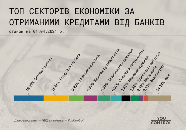 Больше всего кредитов от украинских банков получили предприятия оптовой, розничной торговли, электроэнергетики, пищевой промышленности и сельского хозяйства.