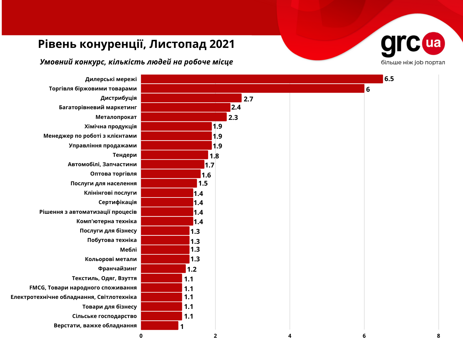 Небольшой конкурс 1,2 специалиста на 1 рабочее место для отрасли Продаж услуг для бизнеса, розничной торговли и прямые продажи. Конкуренция в 1,3 специалиста на 1 рабочее место для отрасли Продаж услуг для населения и торговые сети. И с близкими по значению показателями: 2,2, 2,4, 2,9 специалиста на 1 рабочее место конкуренция для Менеджеров по работе с клиентами, Управление продажами и Оптовая торговля соответственно.