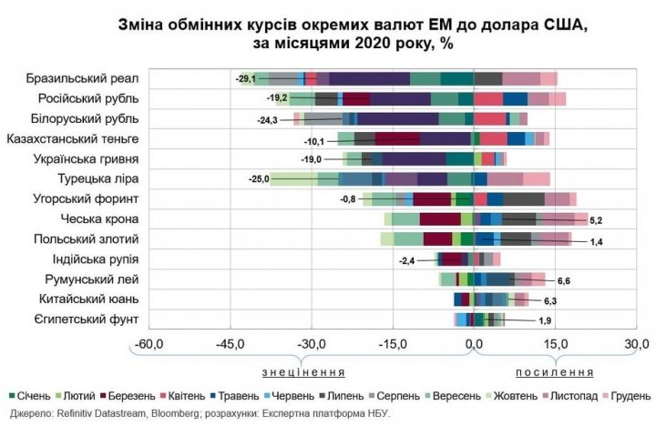 Экспертная платформа Национального банка Украины сообщила об итогах мирового валютного рынка в 2020 году. В первую очередь специалисты обратили внимание на то, как менялись валюты отдельных стран emerging markets, а прежде всего Украины.