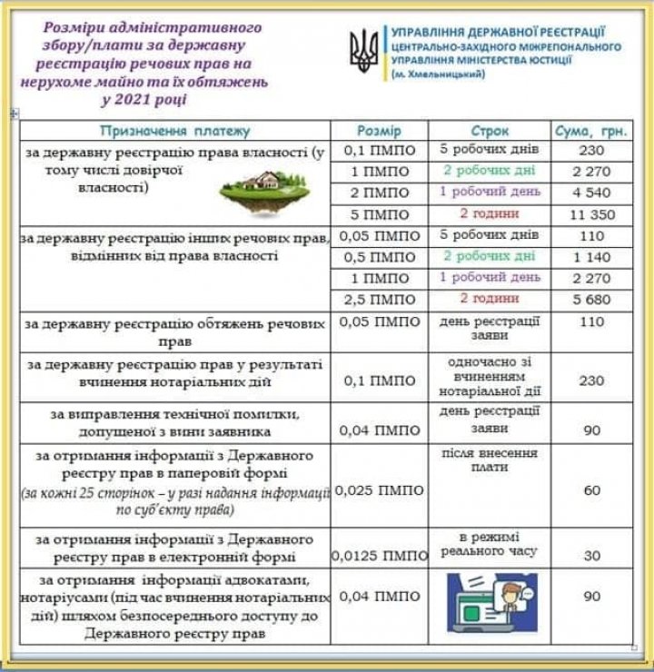 Закон Украины «О государственной регистрации вещных прав на недвижимое имущество и их обременений» и Закон Украины «О государственной регистрации юридических лиц, физических лиц-предпринимателей и общественных формирований» устанавливают, что административный сбор взимается в соответствующем расчете от прожиточного минимума для трудоспособных лиц в месячном размере, установленном законом на 1 января календарного года, в котором проводятся регистрационные действия и округляется до ближайших десяти гривен.