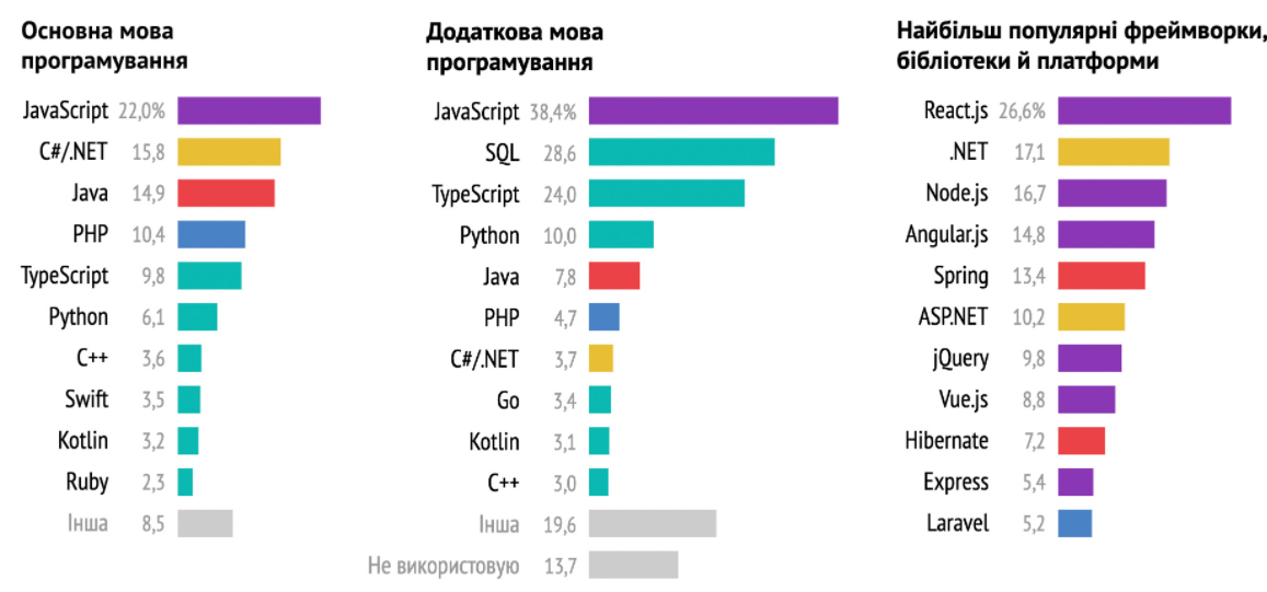 По результатам летнего опроса украинских ІТ-специалистов по их работе и зарплатам, самым популярным языком программирования является JavaScript. Им пользуются 60% разработчиков: 22% используют его как основной язык, а еще 38% как дополнительный.