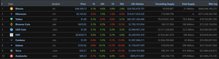 На момент написания новости (17:00) биткоин торгуется в районе $44 300, Ethereum — у отметки $3100. Ниже представлены топ-10 монет по рыночной капитализации: