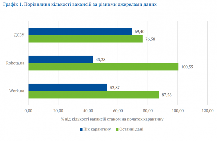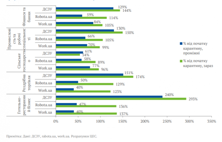 На сайте work.ua также заметно существенное сокращение вакансий: в худший период (21 апреля) на сайте публиковали лишь 43% от количества в докарантинный период. Однако по состоянию на 23 июня количество вакансий почти полностью восстановилось и составило 88% от докарантинного периода.