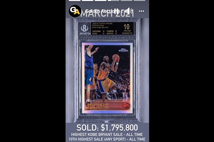Коллекционная карточка с изображением погибшего в прошлом году американского баскетболиста Коби Брайанта ушла с молотка аукциона Goldin Auctions за рекордные почти 1,8 миллиона долларов. Об этом сообщает аукционный дом, специализирующегося на продаже подобных предметов коллекционирования, на своей странице в Facebook.