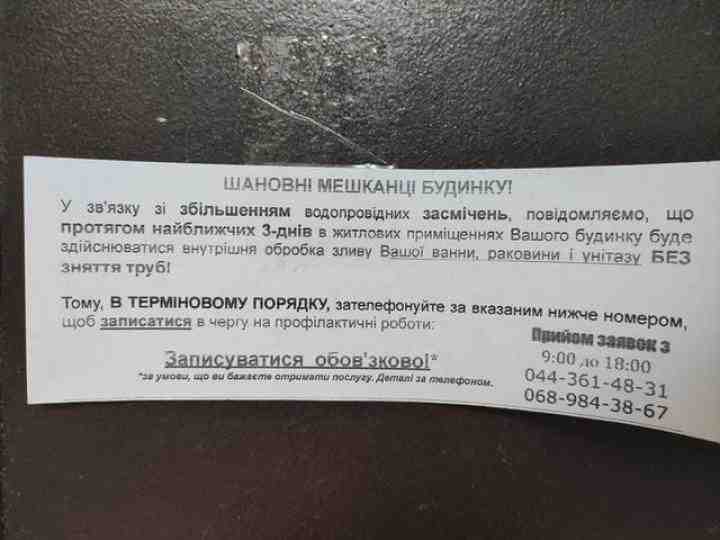 «Киевводоканал» обратил внимание потребителей на новый вид мошенничества: на подъездах домов стали появляться объявления об услугах «обработки слива раковины, ванны и туалета без снятия труб», которые якобы необходимы в связи с увеличением водопроводных засоров.
