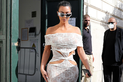 40-летняя знаменитость приехала в резиденцию Папы Римского в компании супермодели Кейт Мосс и ее 18-летней дочери Лилы Грейс. В качестве наряда Кардашьян выбрала облегающее белое платье Barragan из кружева с оголенными плечами, а также вырезами на спине и бедрах. Свой образ она дополнила босоножками и солнечными очками в стиле 90-х.