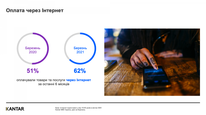 В марте 2021 года уже 62% украинских интернет-пользователей в возрасте 16-65 лет декларировали, что оплачивали товары и услуги через интернет. Это на 22% больше по сравнению с докарантинным началом 2020 года.
