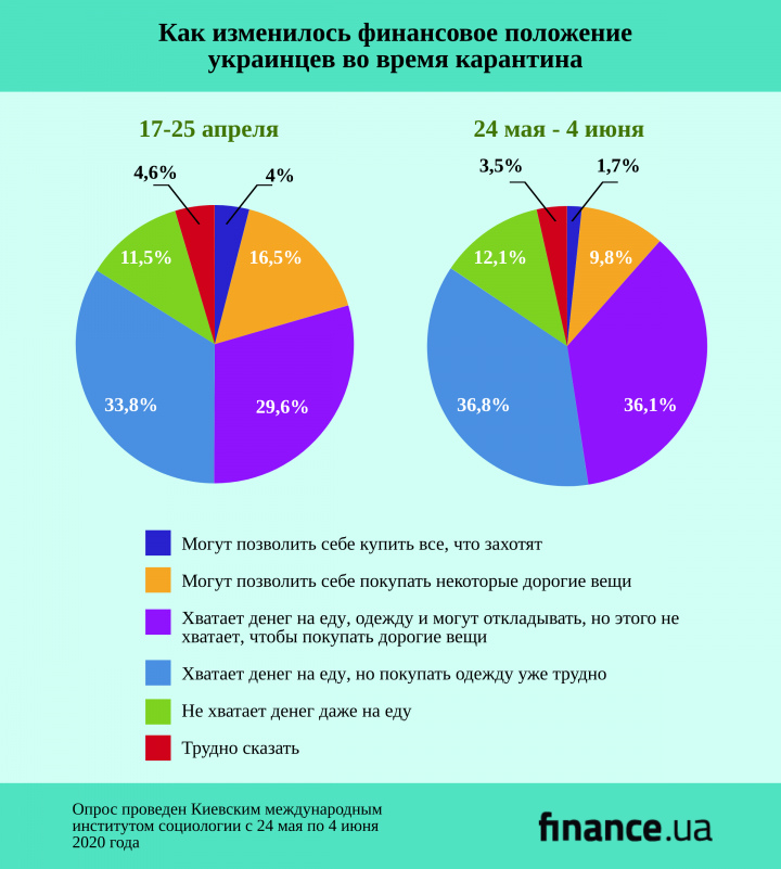 Социологи в конце апреля и в начале июня просили респондентов оценить финансовое состояние их семьи на текущий момент. Если в апреле условно “богатых” людей, которые могли позволить приобрести что-то ценное, например телевизор, либо вовсе не ограничивали себя в расходах, было 20,5%. То по состоянию на начало июня их доля сократилась до 12%.