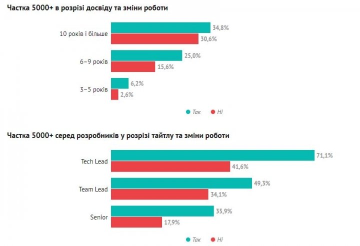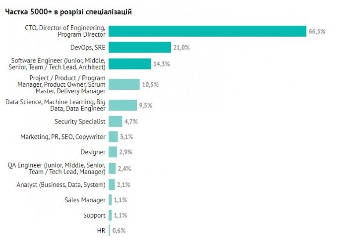 ІТ-специалисты, которые имеют самые высокие зарплаты, — СТО, Director of Engineering, Architects (около 70% получают более $5000), разработчики высокого уровня (23% Senior, 36% Team Lead, 45% Tech Lead получают больше $5000), DevOps и SRE (21%), QA-специалисты начального уровня (менеджеры, техлиды — 24%), Delivery Managers (34%).