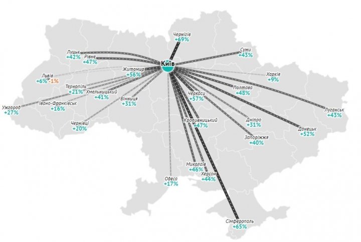 Есть только два региона, для которых Киев — не основное направление миграции. Это Ивано-Франковск и Тернополь, откуда во Львов едут чаще, чем в Киев (хотя в Киев из этих регионов тоже едут многие).