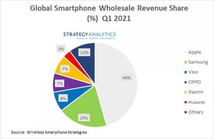 Практически половину всей выручки — 46 % — по итогам прошлого квартала получила Apple. На втором месте с большим отставанием находится южнокорейский гигант Samsung — 19 %.