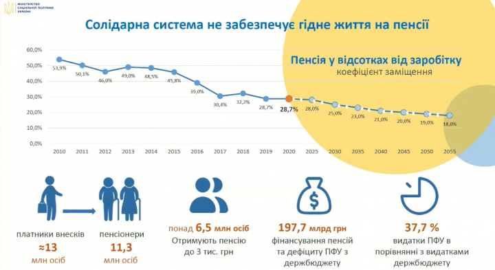 Она обратила внимание на прогнозы по коэффициенту в 2055 году: по подсчетам экспертов, тогда украинцы будут получать пенсии, которые составят лишь 18% от их заработка.