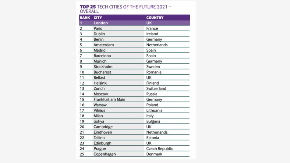 Для рейтинга Tech Cities of the Future 2021 были проанализированы данные 76 городов в 31 европейской стране по пяти категориям: рентабельность, экономический потенциал, показатели прямых иностранных инвестиций, инновации и привлекательность и среда для стартапов.