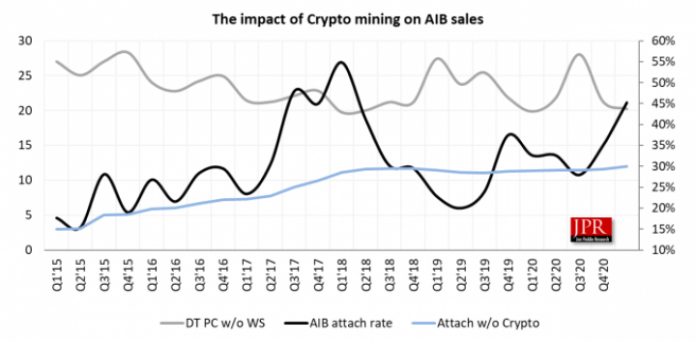Аналитики Jon Peddie Research (JPR) в свежем исследовании оценили влияние майнеров на сегмент дискретных видеокарт (add-in boards) в первом квартале 2021 года.