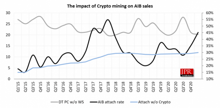 В качестве отправной точки аналитики взяли коэффициент, отражающий соотношение проданных дискретных GPU и других комплектующих персональных компьютеров. Аналитики утверждают, что если обычно распределение составляет 25% (видеокарты) и 75% (комплектующие), то в январе-марте 2021 года оно составило аномально высокие 50 на 50.