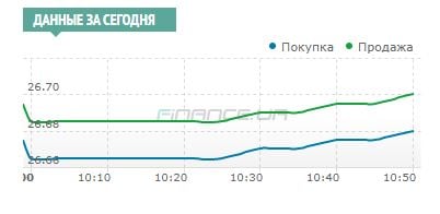 Доллар: коридор покупок и продаж 26,55 — 26,90 грн при спреде в обменниках финкомпаний в пределах 15−20 коп, а в кассах банков до 25 коп.