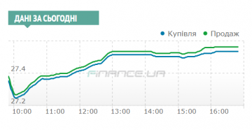 Доллар за день вырос с утренних 27,25/27,27 гривен сразу до 27,53/27,56.