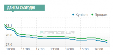 1) Доллар с утренних стартовых 28,08/28,10 гривен просел до 27,94/27,96 к концу дня, а евро — с 32,10/32,13 до 31,9549/31,9778 гривен.