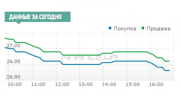 доллар с утренних 27,00/27,03 гривен подешевел до 26,93/26,96 к концу дня;