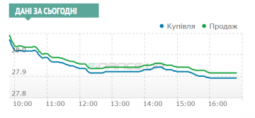 Стартовав с утренних 28,02/28,04 гривен уже к 11 часам доллар просел до 27,985/28,005 гривен. Особого спроса на валюту не было и котировки поползли вниз. К 12 часам курс опустился до 27,935/27,955 гривен, а к обеду — до 27,92/27,94.