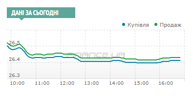 Это оказало свое влияние на поведение участников торгов и в 11:00 доллар котировался в пределах 26,425/26,445 гривен, а к 12:00 даже ненадолго подорожал до 26,43/26,455.