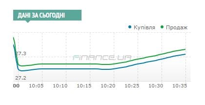 Доллар: коридор покупок и продаж 27,10 — 27,55 грн при спреде в обменниках финкомпаний в пределах 15−20 коп, а в кассах банков до 25 коп.