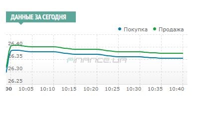 Доллар: коридор покупок и продаж 26,20 — 26,55 грн при спреде в обменниках финкомпаний в пределах до 15−20 коп, а в кассах банков до 20−25 коп.