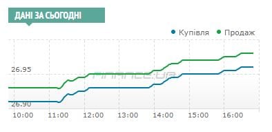 С 10 часов до 11 часов доллар находился в пределах 26,91/26,93 гривен с небольшим трендом на рост котировок. К 12 часам под воздействием интервенции Нацбанка курс остановился в пределах 26,93/26,95 гривен и продержался на этом уровне до 14 часов.