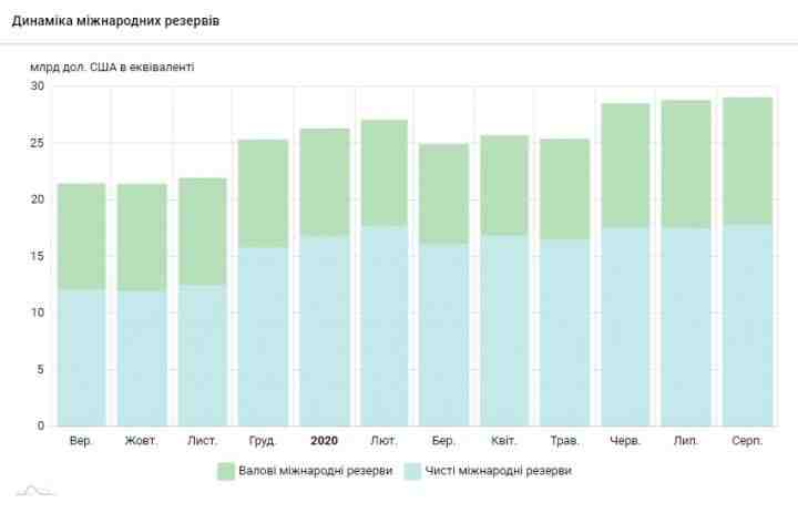 Объем международных резервов Украины на протяжении августа 2020 года вырос на 0,9% (на 246,22 млн долларов). На 1 сентября он составил 29 048,71 долларов.