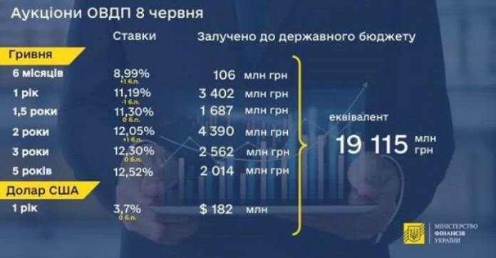 Министерство финансов во вторник, 8 июня, провело аукцион по продаже облигаций внутреннего госзайма, на котором привлекло в госбюджет 19,1 млрд грн, что является рекордным аукционом ОВГЗ в этом году.