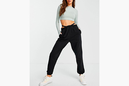 На размещенных кадрах манекенщица позирует в босоножках на каблуках и джоггерах черного цвета с деталями, имитирующими торчащее белье. При этом за счет спущенных штанов бедра девушки частично обнажены. Стоимость вещи с низкой посадкой марки Asos Design составляет 2190 рублей.