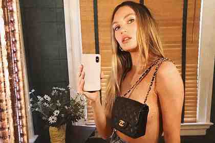 На снимке 31-летняя манекенщица фотографирует себя на камеру смартфона. Она позирует в серых джинсах с завышенной талией и без верхней части. Образ знаменитости дополняет небольшая черная сумка люксового французского бренда Chanel, которая прикрывает ее обнаженную грудь.