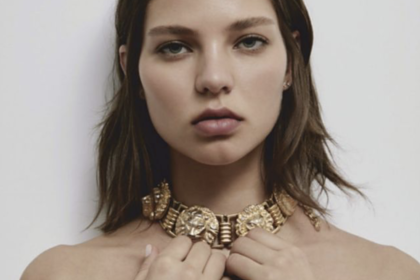 Российскую модель также сфотографировали в колье бренда Gucci топлес, однако на снимке она прикрывает обнаженную грудь руками.