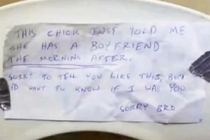 Он рассказал, что нашел под сиденьем унитаза записку, в которой говорилось, что возлюбленная провела ночь с другим.
