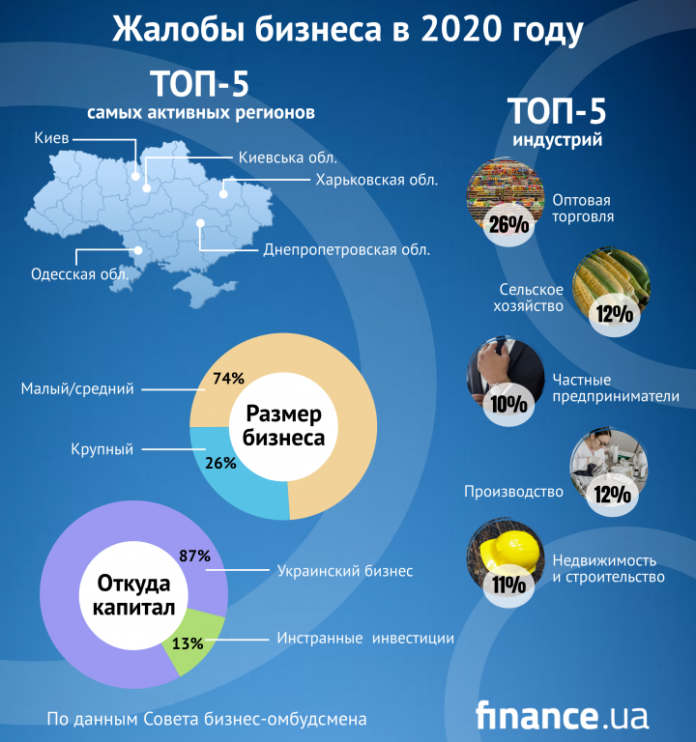 по происхождению капитала: украинский бизнес 89% жалоб, компании с иностранными инвестициями — 11%;