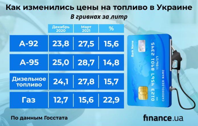 по данным статистического ведомства, в марте по сравнению с декабрем 2020 года бензин А-92 подорожал на 15,6% до 27,5 гривен за литр;