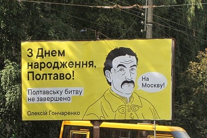 Активисты разместили на улицах Полтавы большие билборды с изображением гетмана Войска Запорожского Ивана Мазепы и призывом идти «на Москву». Сообщение об этом появилось в Telegram-канале депутата Верховной Рады Украины от фракции «Европейская солидарность» Алексея Гончаренко.