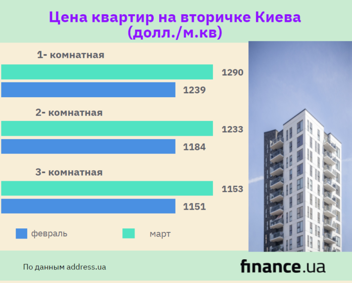 В марте 2021 года медианная цена предложения квартир на вторичном рынке Киева, представленных в базе данных портала, увеличилась на 1,6% по сравнению с февралем 2021 г., и составила 1247 долл. США/кв. м.